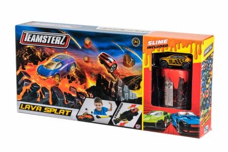 Din lille racer vil ha oppleve uendelig moro med Teamsterz lavasplat-bane. Bilen kjøres fort langs racerbanen med den elastiske løfterakketen. Se hvordan bilene fyker over rampen og kræsjer i den giftige avfallsbeholderen fylt med slim.