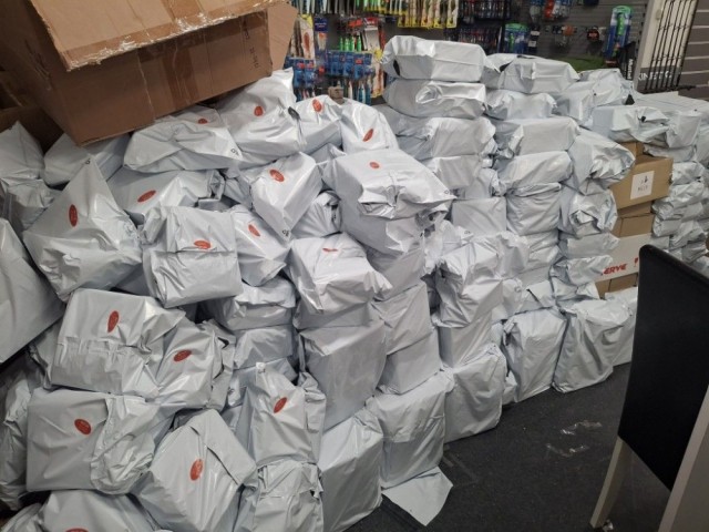 Pakkene er lukket, ikke åpnet av noen. Alle avsender- og mottakerdata er sensurert.